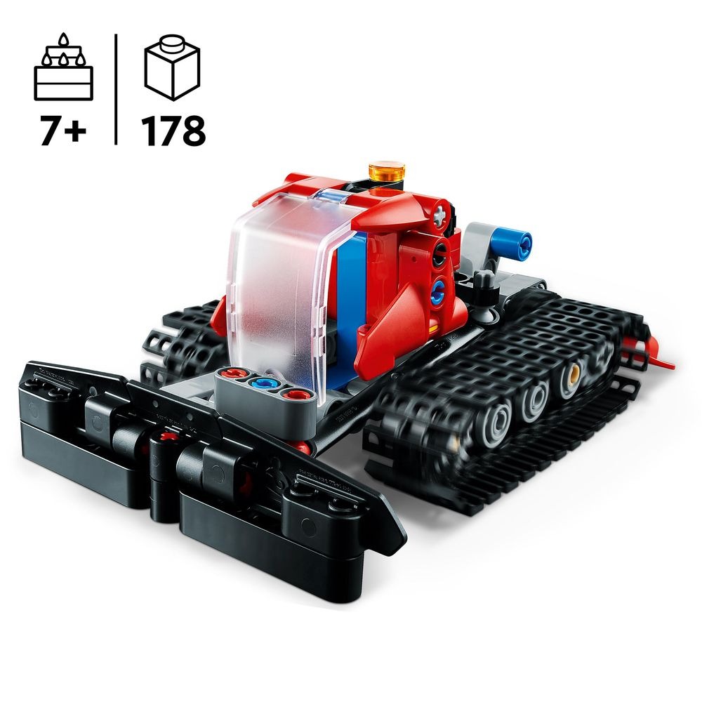 کیت LEGO Technic Snow Groomer 42148 با 178 قطعه یک مدل کوچک اما دقیق از ماشین تسطیح برف واقعی را ارائه میدهد که دارای چرخهای لاستیکی، تسمههای حرکتی و اهرمهایی برای بالا و پایین بردن تیغه است.